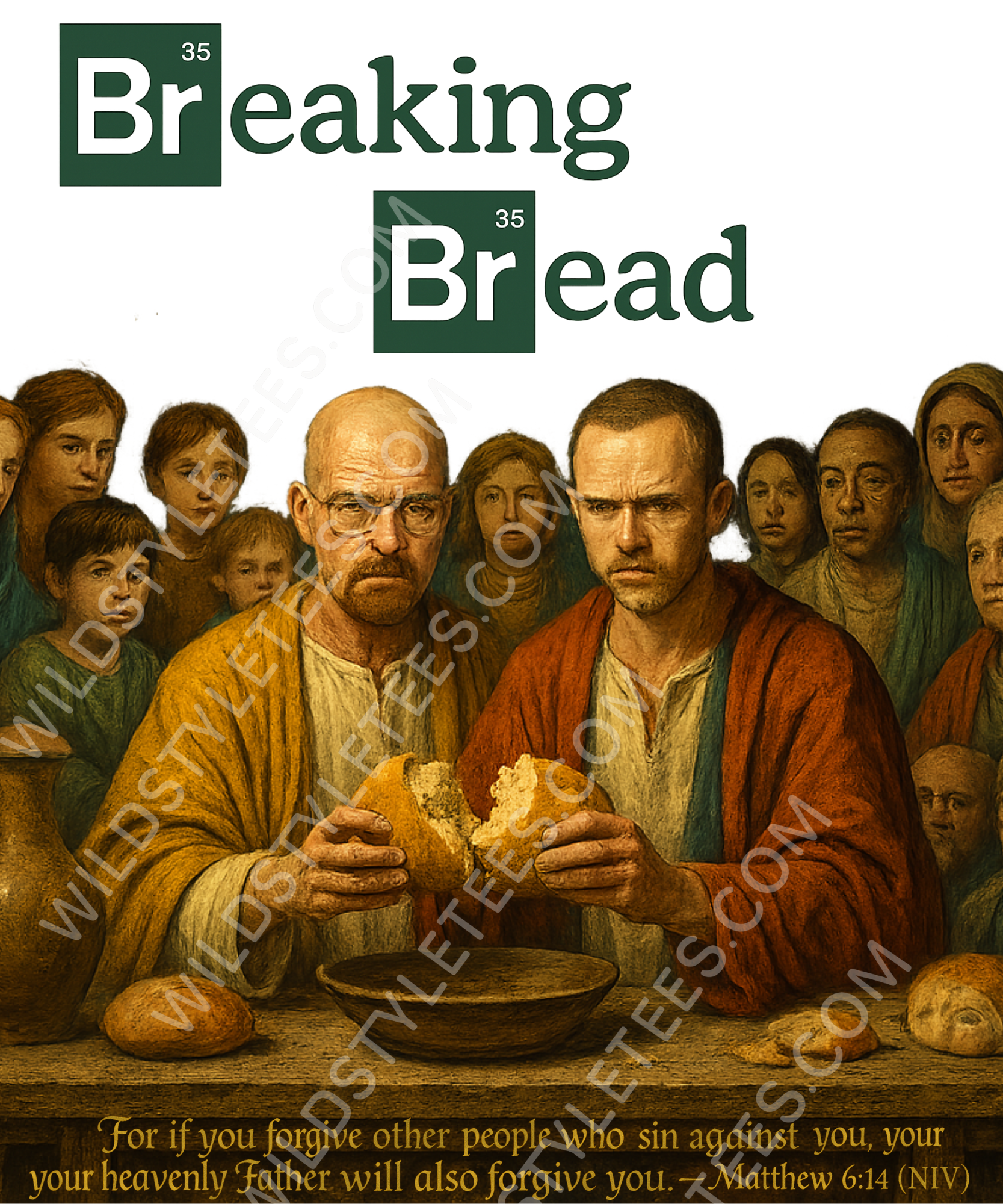 Craving a fresh statement piece? Our Breaking Bread tribute tee fuses tongue-in-cheek fan art of Walter White & Jesse Pinkman from Breaking Bad with a nod to the timeless act of “breaking bread” in scripture.